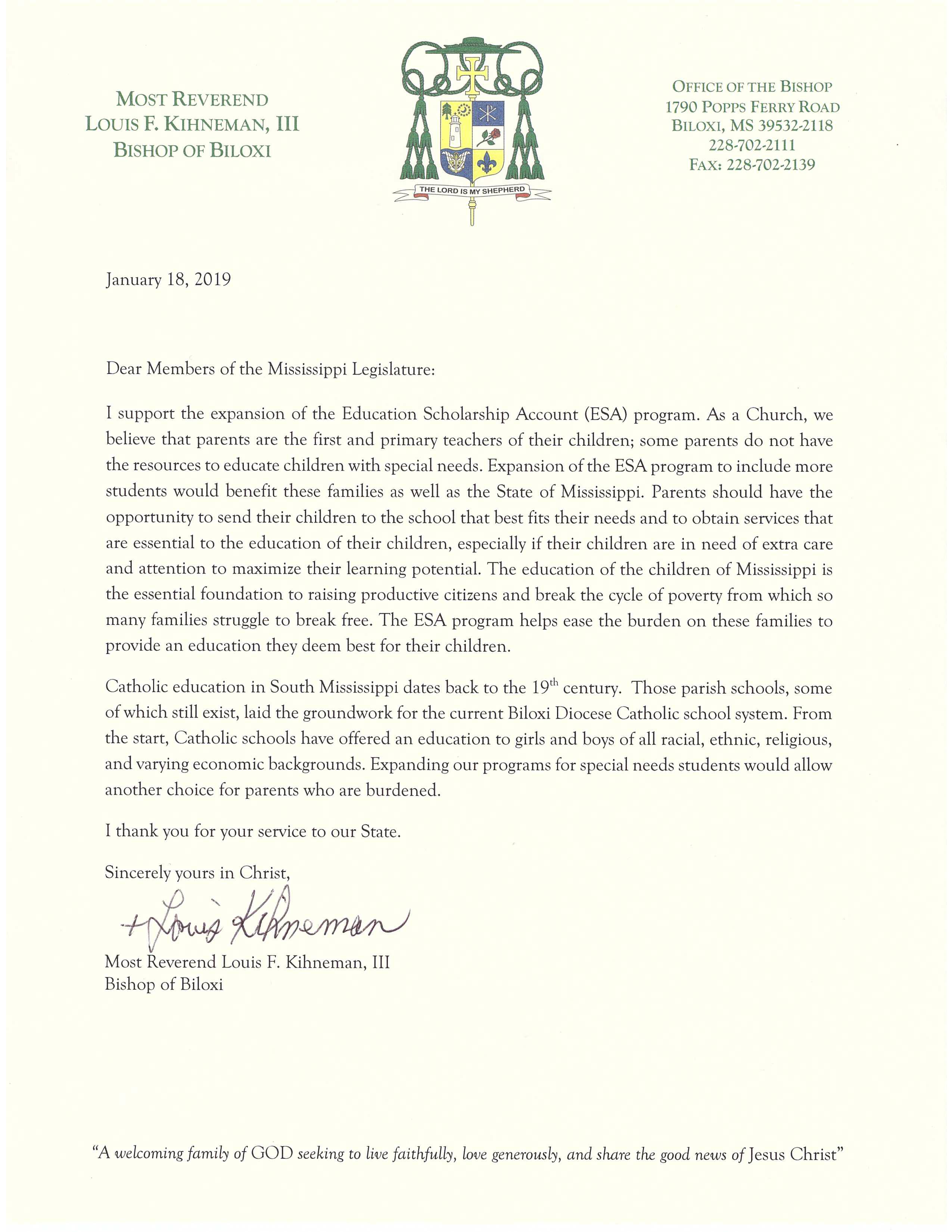 Biloxi Bishop Louis F. Kihneman, III, echoed the sentiments of Jackson officials in his letter to the legislature.