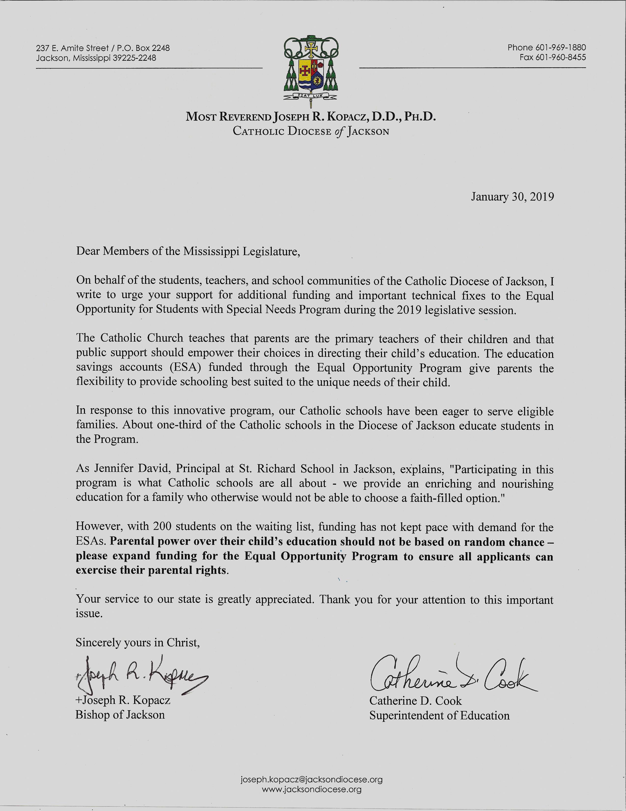 “Our Catholic schools have been eager to serve eligible families,” their letter stated. “About one-third of the Catholic schools in the Diocese of Jackson educate students in the program.”